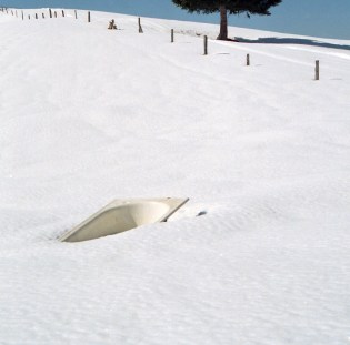 The bathtub in the snow reveals that we are here on a mountain pasture in winter. The cows are in their shed down in the valley. The marmots are hibernating in their holes underground. And the people have closed their summer chalets and have moved to their homes lower down.