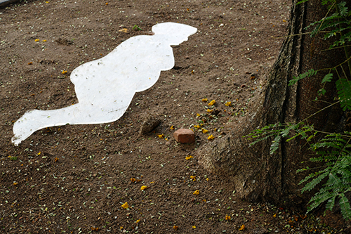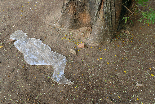 I was actually more intrigued by another part of her installation: the cut-out shapes in plexiglass of bodies lying down. In two projected photos she has placed a body shape on the ground next to a grave. In the courtyard of the exhibition ground one could see an actual plexiglass body form under a tree. The form is transparent. Seen from one angle it reflects the bright sky and looks completely white, while from another angle the soil underneath shines through.