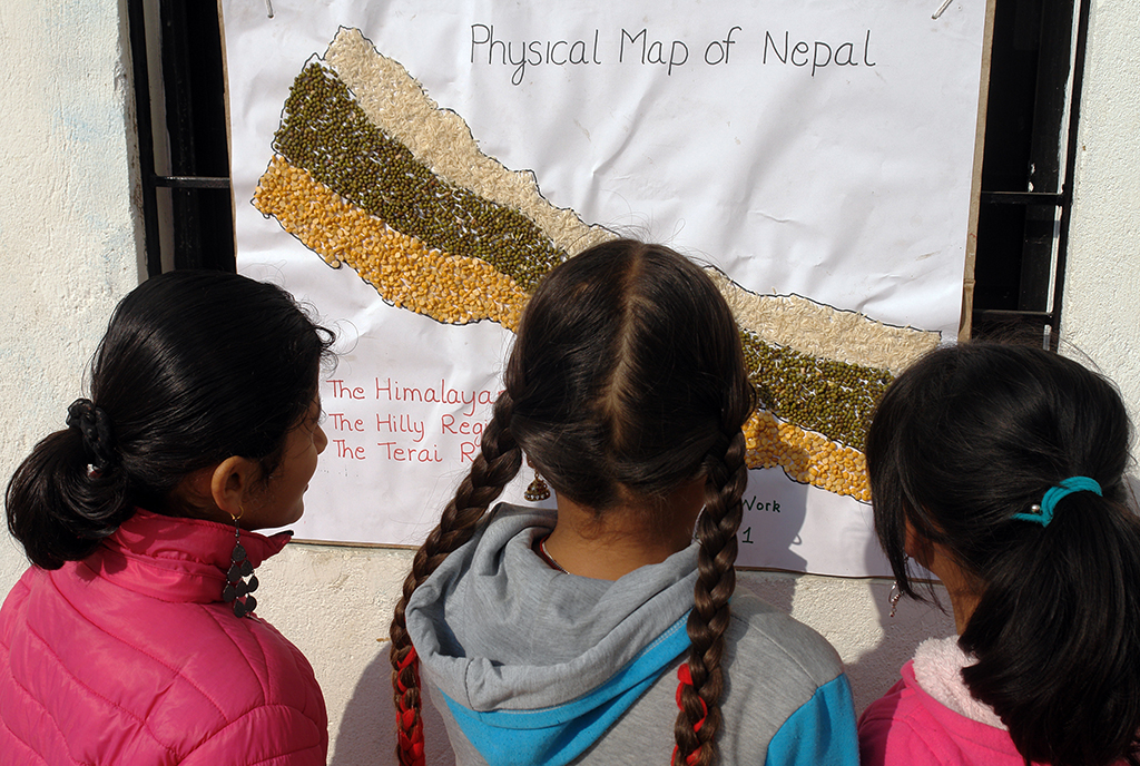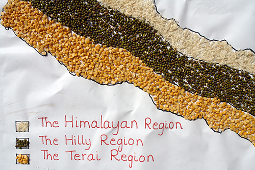 The staple food of Nepal used for making a map of the country. Lentils and rice. Nice idea of the children and their teacher!