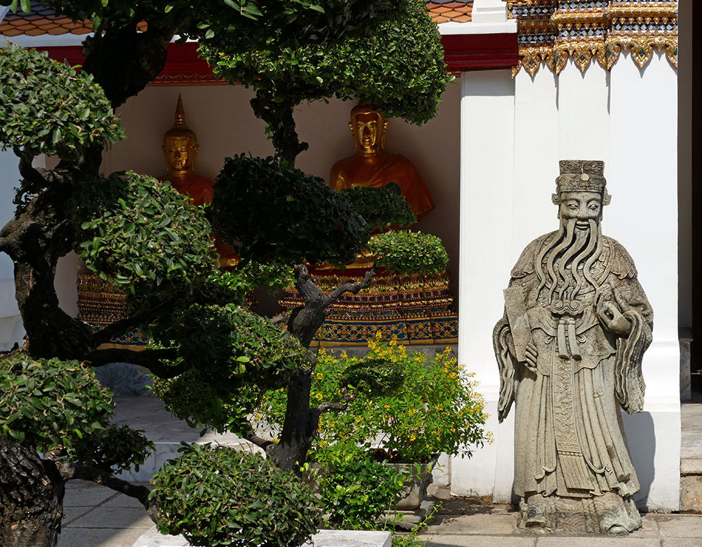 The stone statue can easily be recognized as Chinese; the way the tree branches have been steered in their growth betrays Japanese inspiration; and the Buddha images in the back are clearly Thai. Three examples of three Asian aesthetic traditions harmoniously brought together in a corner of the temple complex of Wat Pho.