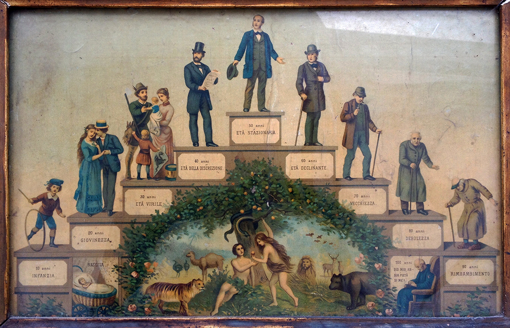 I saw this little picture hanging on the wall of a house in Italy. It depicts the life of man before and after the fall. In the centre, the idyllic existence in the Garden of Eden is about to come to an end with Eve presenting to Adam the forbidden fruit from the tree of knowledge of good and evil. We all know the story.