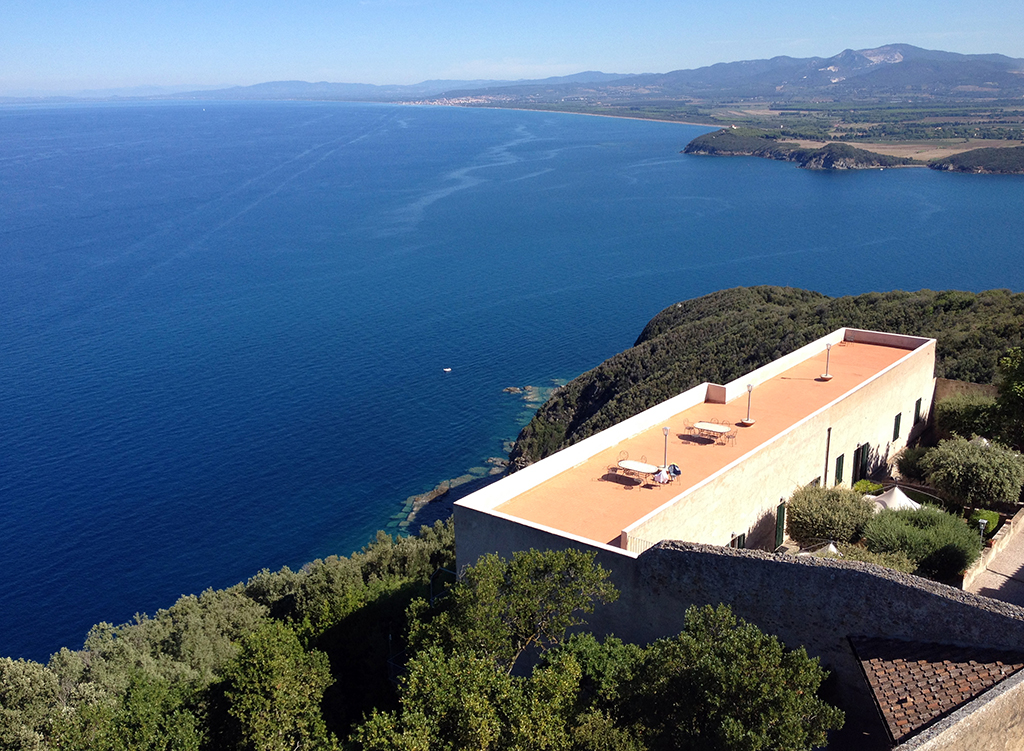 The enormous empty roof terrace seems to be crying in vain for holiday-makers: Please come and enjoy the magnificent view over the Gulf of Baratti. But silence reigns. It’s covid times.