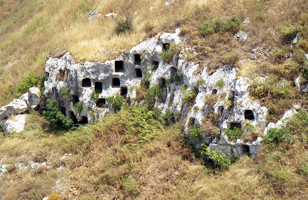 At Pantalica, on the island of Sicily, humans have cut holes in rocks to serve as burial chambers. Their necropolis dates from 13th to 7th century BC.