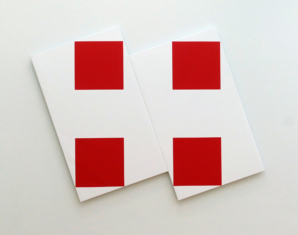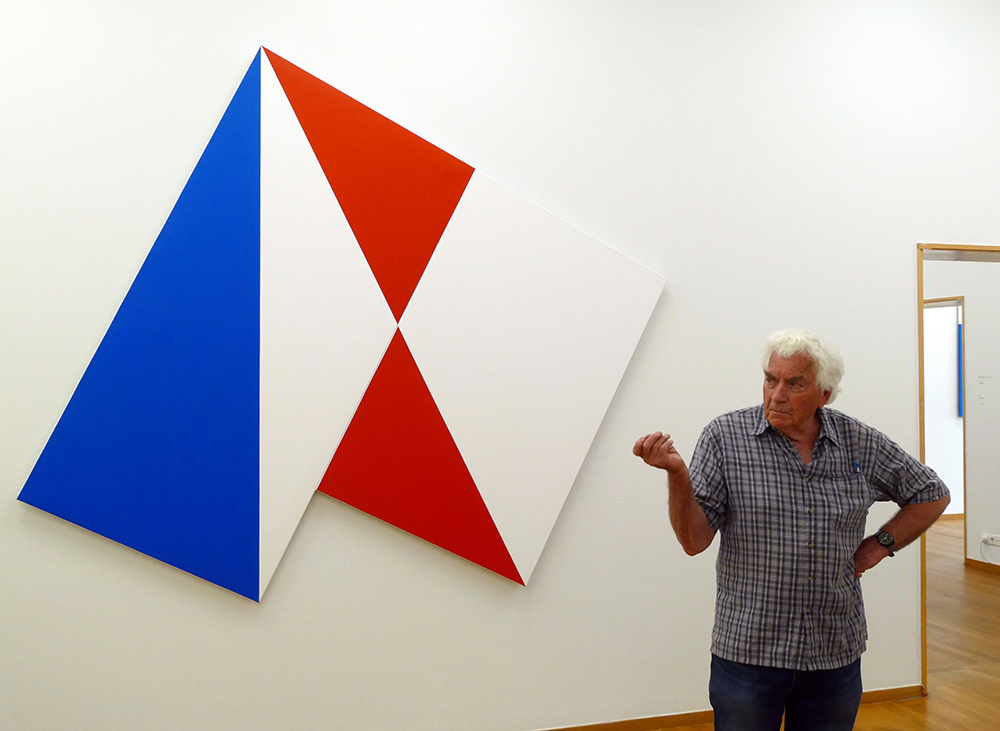 Since the beginning of the 1960s Bonies has made shaped canvases: abstract works of canvases joined together and painted with monochrome red, blue and sometimes also yellow and green on parts of the plain white canvases. The canvases with their areas of colour joined together constitute the art works. All his works are starting from this basic principle. Put up as objects slightly in front of the white museum walls, they are indicated with no other title than ‘Acryl on canvas’ and the year they were made. See for instance the paintings on the two photos below: one relatively early work made in 1968 and the other more recently in 2017. Examples of sixty years of persevering constancy!