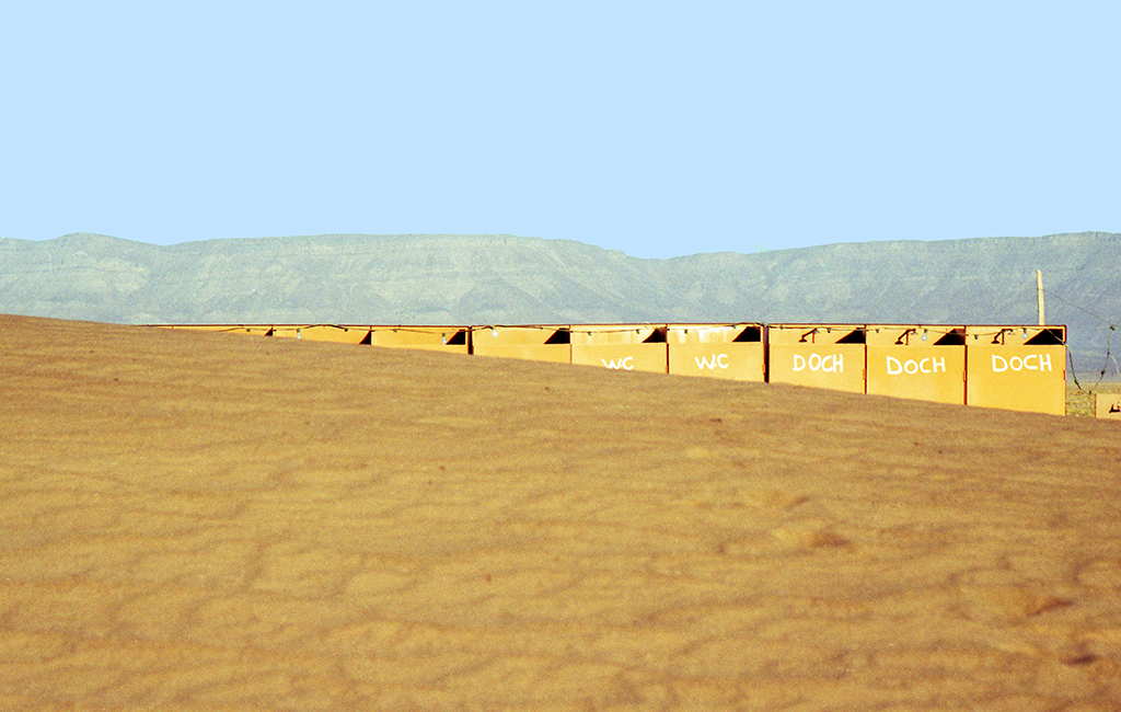 A row of WC’s and DOCH’s (sic) as a weird fata morgana in the sand dunes near Tinfou.
