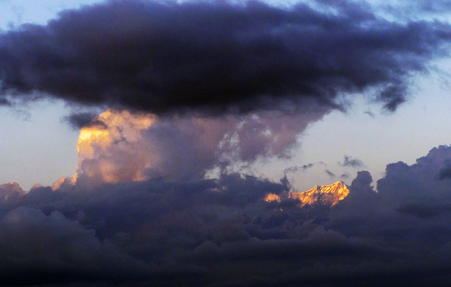 And then, in the late sun at the end of the day, Maiktoli peak suddenly shows up between the dramatic bank of clouds hanging over the Nanda Devi chain of Himalayan mountain tops.