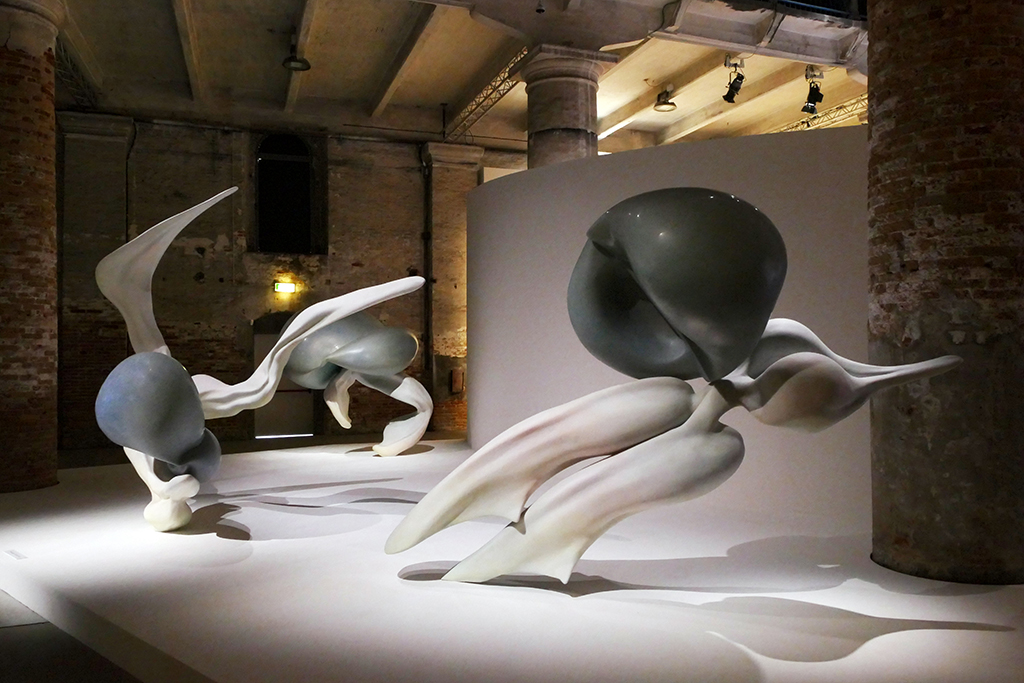 Meeting with the installation Migrations by Marguerite Humeau at the Venice Biennale my first reaction is: this isn’t for me. Her strange sculptures don’t appeal to me, falling completely outside of my esthetic framework. The three sculptures have names of important oceanic currents and the accompanying text talks about ‘supernatural, biomorphic sculptures’ and ‘sinuous marine sculptures as if caught in acts of migration’. The designation ‘sinuous marine sculptures’ gives me some hold. It appeals to my imagination and I start actually getting intrigued by these strange forms. My interest still increases when I read the list of materials that have gone into their construction: biological and synthetic resin and polymers, salt, algae, seaweed, bone, pigments, mineral dust, ocean plastic, glass, stainless steel structure. This is truly extraordinary. Now I start seeing them as peculiar marine animals, like jelly fish, floating through the oceans in flowing movements, breathing, successively contracting and expanding. Here they stand on a platform at an exhibition, hence they need a ‘stainless steel structure’ to keep themselves upright. That they also contain ocean plastic and glass we can take as a sign of the artist’s concern about the pollution of the oceans, but also as an indication of how these creatures know to adapt themselves to changes in their environment.