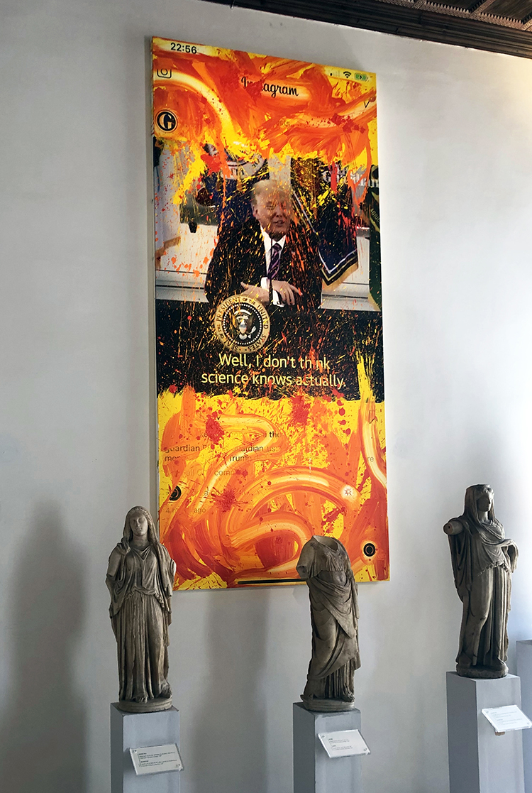 During the consecutive lockdowns of the last few years Marc Quinn has made tens of artworks for his project HISTORYNOW which were to be exhibited at the Venice Biennale in the Museo Archeologico Nazionale di Venezia. The basis of all these works is each time a screenshot from his iPhone of news and stories with which present-day scrolling human beings inform themseves about political, cultural, environmental … events happening in the world. The screenshots are then enlarged and printed, and treated by Quinn with paint or other materials.