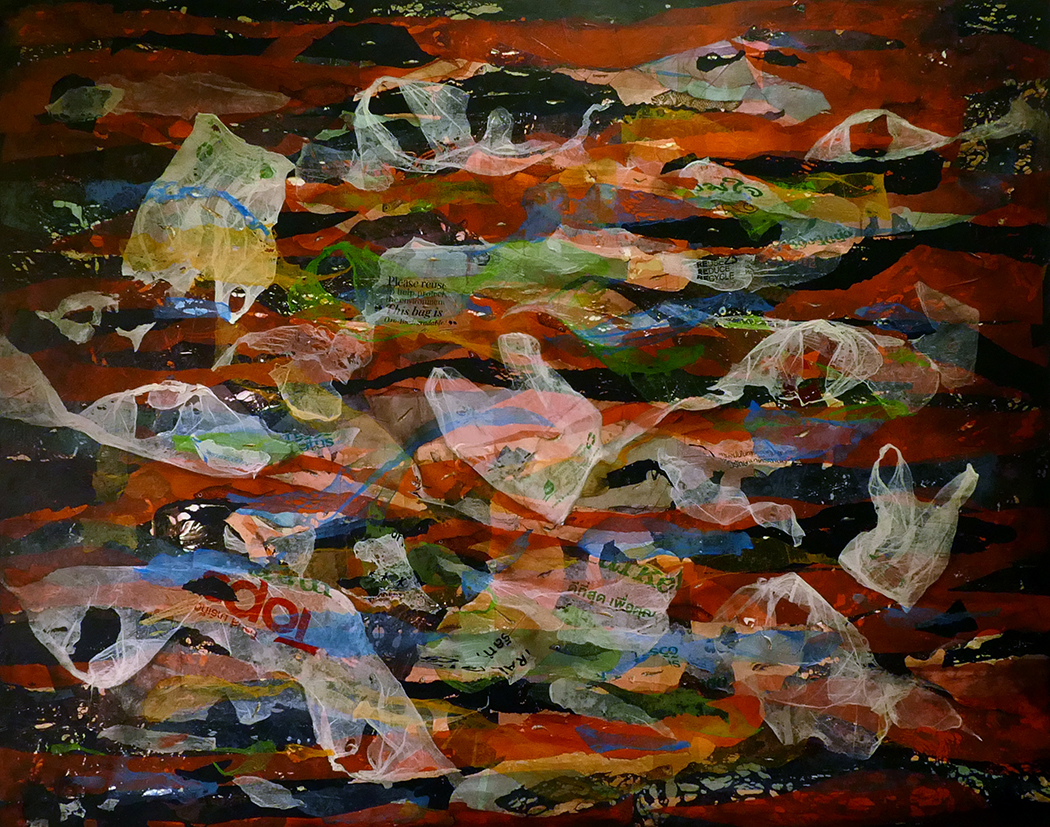 as is printed on one of the plastic bags Teetud used for his painting. Shreds of transparent plastic are floating in … dark, coloured water, or in space? Pollution transformed into an esthetically pleasing art work.