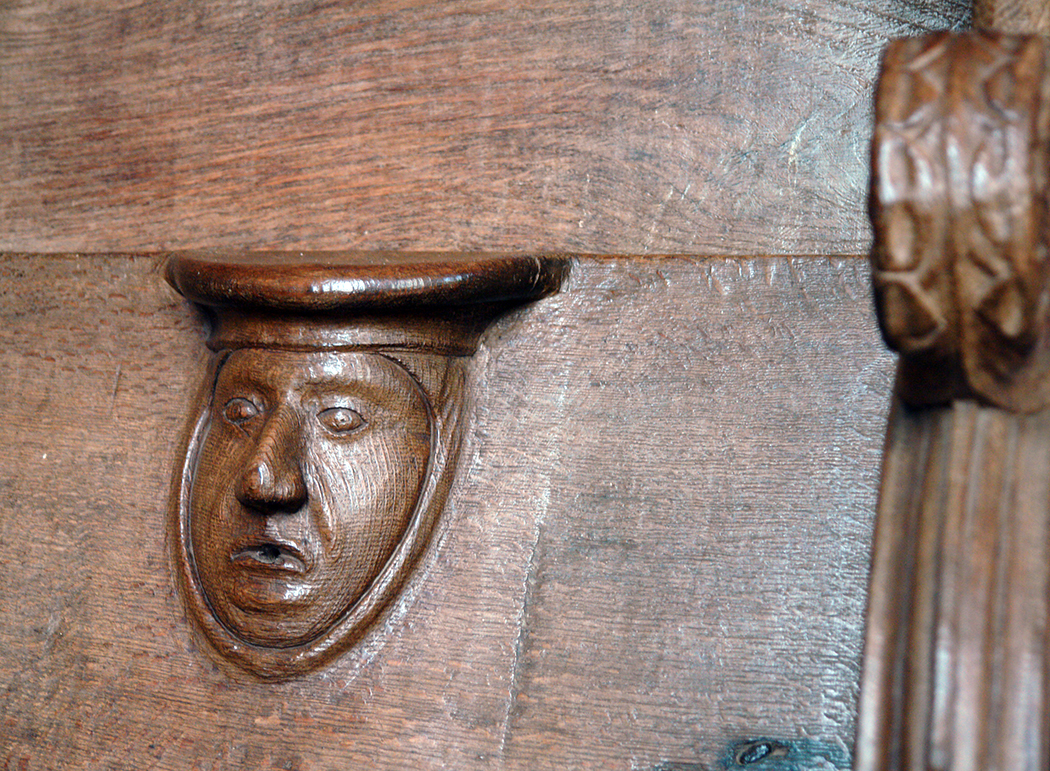 On the underside of the hinged seats of the choir stalls in medieval churches often a ‘misericord’ was carved, a small wooden seat on which the clergyman could lean while he was supposed to stand during long parts of the different services. So normally a misericord was hidden from view, either because the hinged seat was down or because it was covered by the unholy bum of the clergyman. It’s probably for this reason the medieval wood carvers were allowed to indulge in profane witticism for this part of the choir stalls.