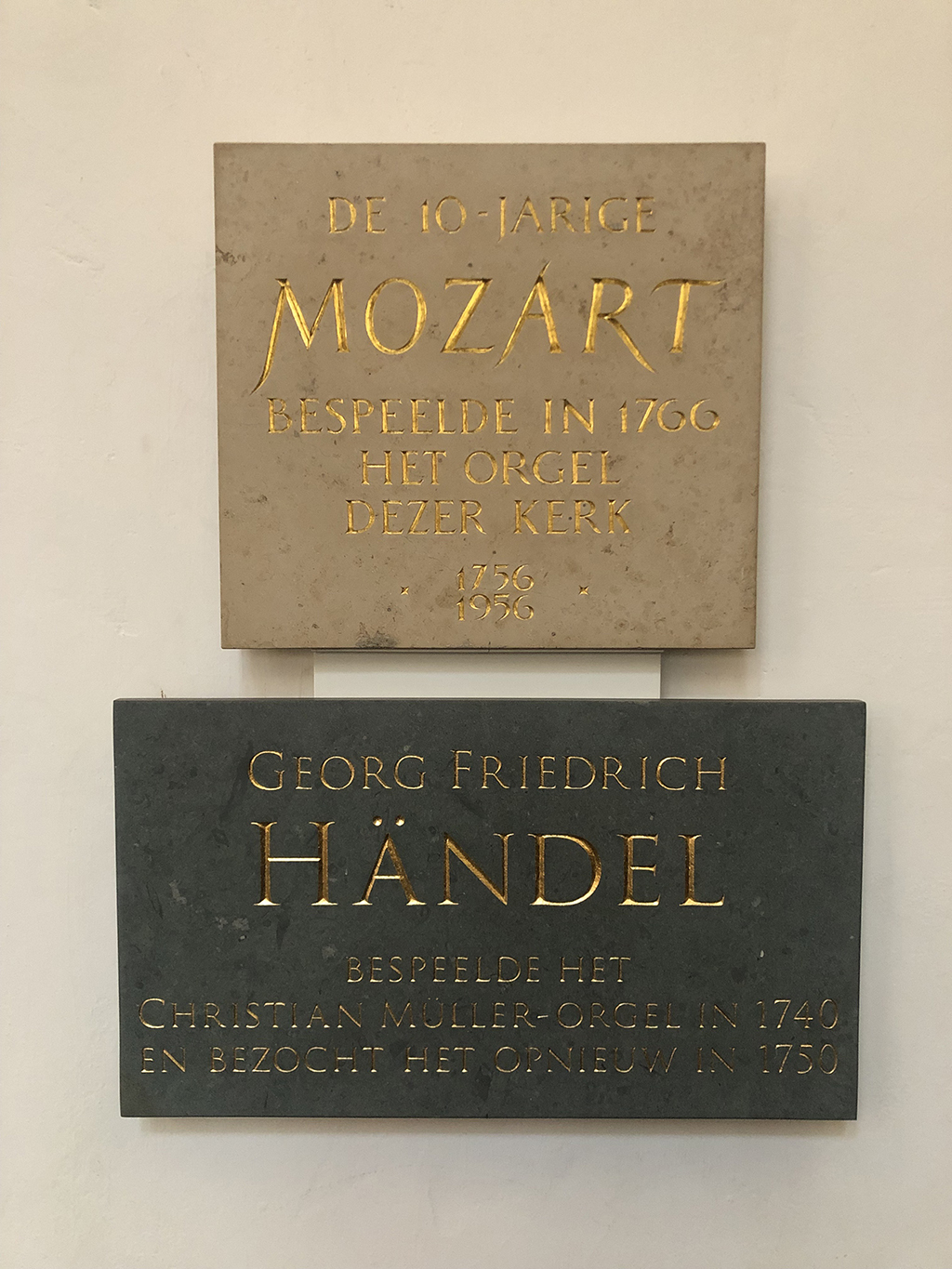 In 1738, word must have spread like wildfire among organists and composers that Christian Müller had built one of the largest organs in the world for installation in the Grote St. Bavo Church in Haarlem. As early as 1740, Georg Friedrich Händel came to the city to play the Müller organ. He did so again ten years later, and in 1766, the 10-year-old prodigy Mozart also came to Haarlem to play the St. Bavo organ. These events were worthy of a memorial stone.