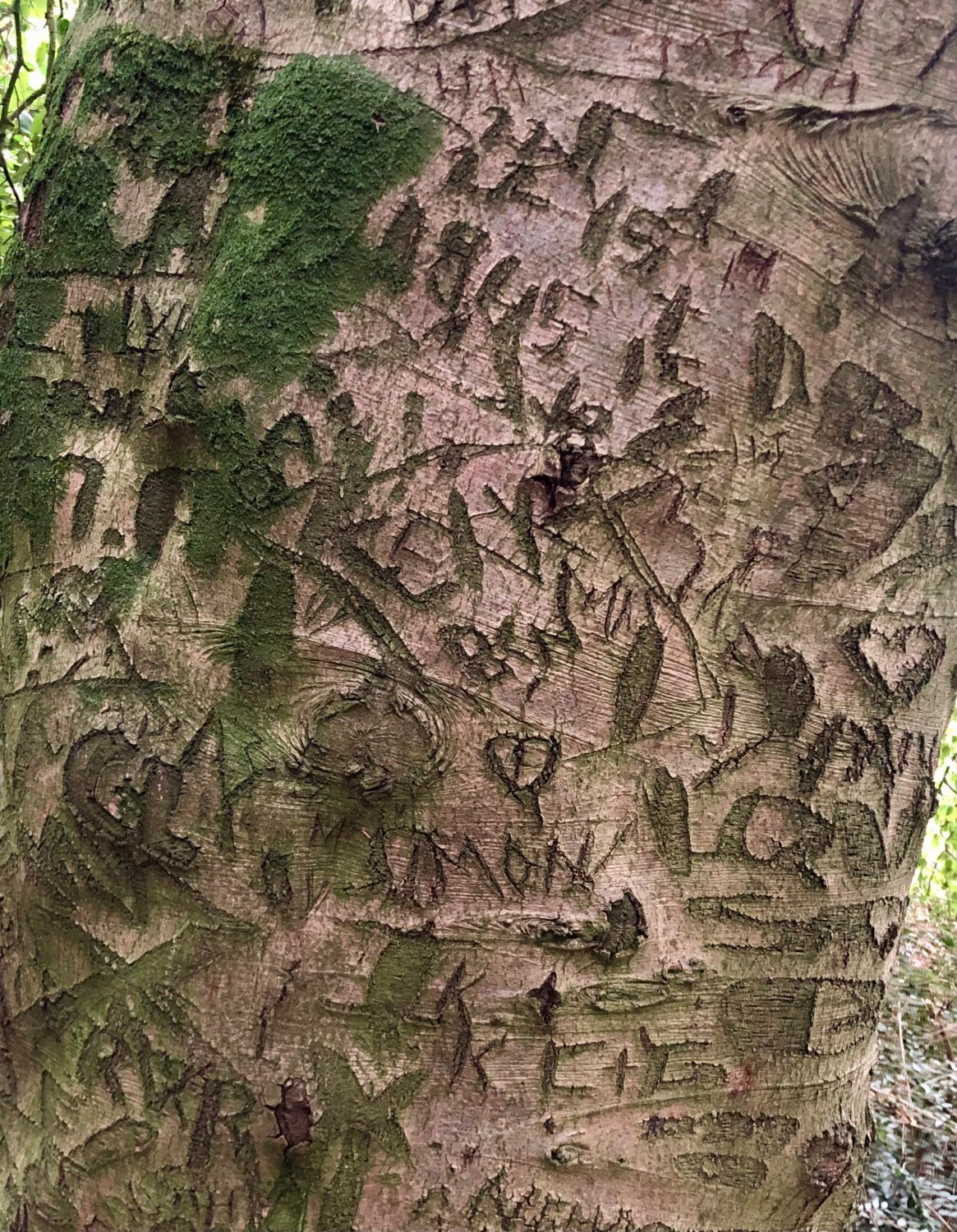 From the very beginning, individuals and couples in love have carved arrows and hearts with their names or initials into the trunk of the tree. Their love may be long gone, but over the years, the marks have grown with the trunk and stretched into scars.