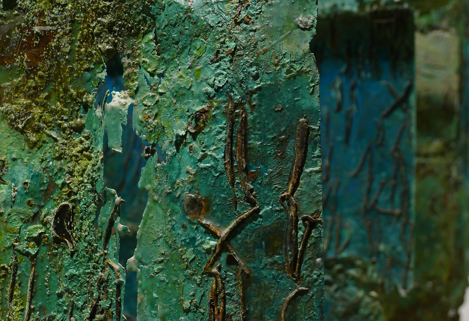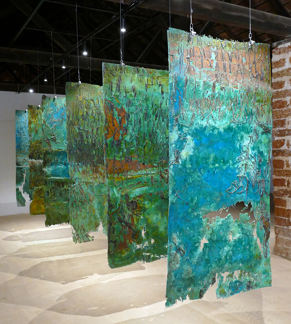 Six large, suspended copper etching plates, barely recognisable as such. By leaving them to soak in ferric acid for a long time and then allowing them to oxidise, all manner of discolourations emerged, predominantly in blue and green, reminiscent of the sea around Kochi. A process of change that continues to this day through contact with the air.