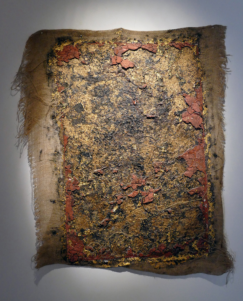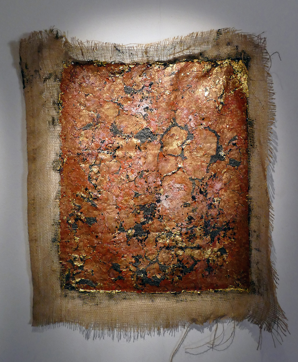 In another series of works, tar, gold leaf and sometimes red pigment have been applied to cotton, with the tar showing cracks as if in scorched earth.